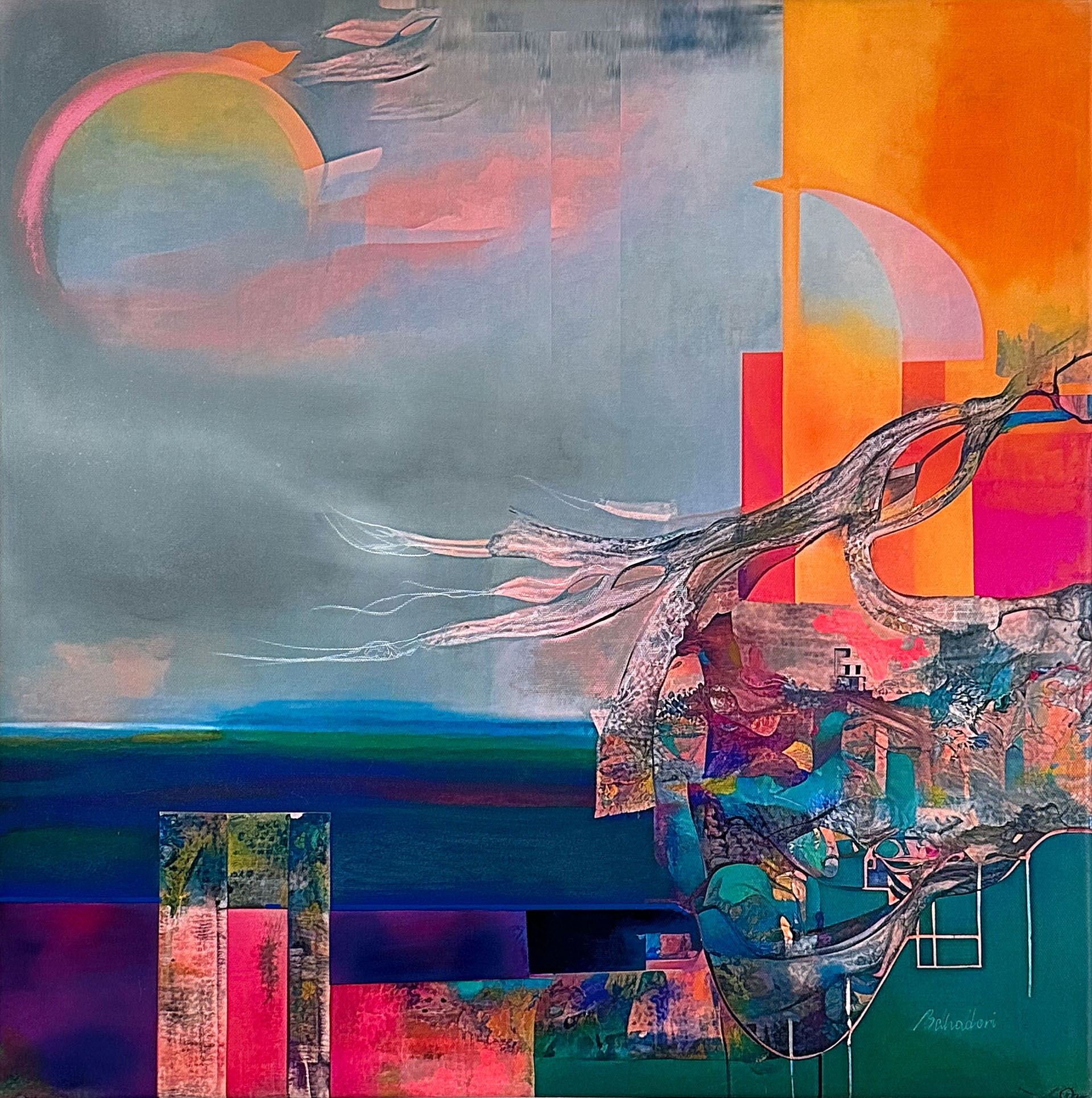 Epic Song, 20×20”, mixed media on canvas, is an imaginary landscape inspired by tales of Azerbaijani Ashugs (troubadour musicians). I’ve combined the abstracted/surreal motifs of a village on top of hills with the folk musical instrument, Saz, doorways and vine forms over the color field background. The colorful eclipse is part of a folk tale I’ve borrowed from. I created the general composition digitally, transferred it onto the canvas and painted with acrylic, dry pastel and spray paint.