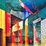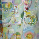“Neighborhood”, 48×36″ mixed media on canvas, was selected by Costa Vavagiakis the juror of the March 2019 show at the Art League. It is a painting inspired by the musical concept of melody (organic forms) and rhythm (geometrical forms) running together and against one another. As for the title “Neighborhood”, the “melody” and “rhythm” create the harmony/community in a visual form with abstracted perspective.