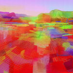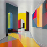 In paintings of this series, I’ve evolved the traditional color field paintings characterized by the Washington Color School, which I studied in depth, into compositions with quasi-perspective grids and elements of nature and architecture as color fields that push them towards somehow recognizable landscapes with a hybrid process—acrylic and ink on pigment print of digital art on heavy art paper mounted on wood.