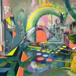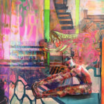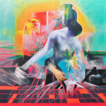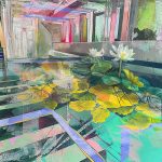 Nature and plant life reclaiming abandoned buildings have been a particular source of inspiration for this painting, which connects with our environmental consciousness. White lotus flowers grow in a flooded abandoned bar or perhaps in mid-air, as there is no clear ground, just abstract reflections and refractions—the void between what is recognizable and the unknown. The viewer is invited to fill in the gaps.