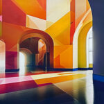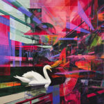 Swan Song is a visualization of orchestral music inspired by classical music. Fragmented color fields vibrate at different levels. I use multidirectional perspectives to mimic musical harmony and my childhood memories of the first large classical performances I attended. The swan with a cut-off reflection is lost in the vast man-made interior, depicting our endangered nature; hence, the swan’s last song.