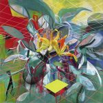 “Pollinia”, 16×40″ acrylic on canvas was selected by Carol Fabricatore the juror of the Art League’s 2020 Flora / Fauna show (March 2020). Pollinia (masses of pollen grains) is a painting from my Music series in which I’ve explored several states of the nature in a single painting. Here the states are more about the seasons and surely more than four seasons—seven to be precise with abstracted flowers, leafs insects and birds. I consider myself a colorist and the theme inspired by flora and fauna is really an excuse to expand on the color palette.
