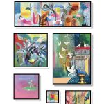 The perspective series is inspired by the rediscovery of the perspective grid among Renaissance artists. While the invention of Cartesian coordinates in mathematics helped move medieval art towards realism, in this series, adding aspects of perspective to abstract gestures results in a somewhat surreal look—vision through a prism or a kaleidoscope of broken glass. I use trapezoids and triangles generated by 3D grids as abstract planes to showcase colors. I further enhance some of my compositions with realistic figures and illustrations as positive distractions. They improve the composition by breaking the symmetry and changing the gaze or focal point. The human, animal, and insect illustrations are additional elements to display color.