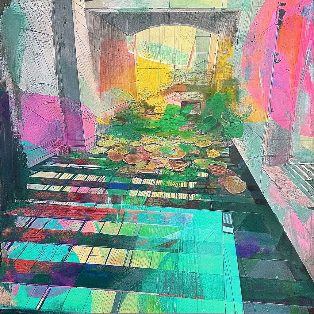 This is another play on reversing the human invasion of nature. Here, a flood of organic forms in the shape of lotus leaves reclaims the manmade structure (geometrical forms). As a colorist, I combine the chromatic push and pull with the perception of depth to generate a more dynamic composition. I took photos of old walls with exciting textures of rocks, concrete and wood, collaged them digitally to create the foundation of the composition, printed the digital image on watercolor paper and then painted over with watercolor, gouache, pastel, and ink (lines) to enhance the grunge look, then mounted on the wood panel sealed with cold wax.