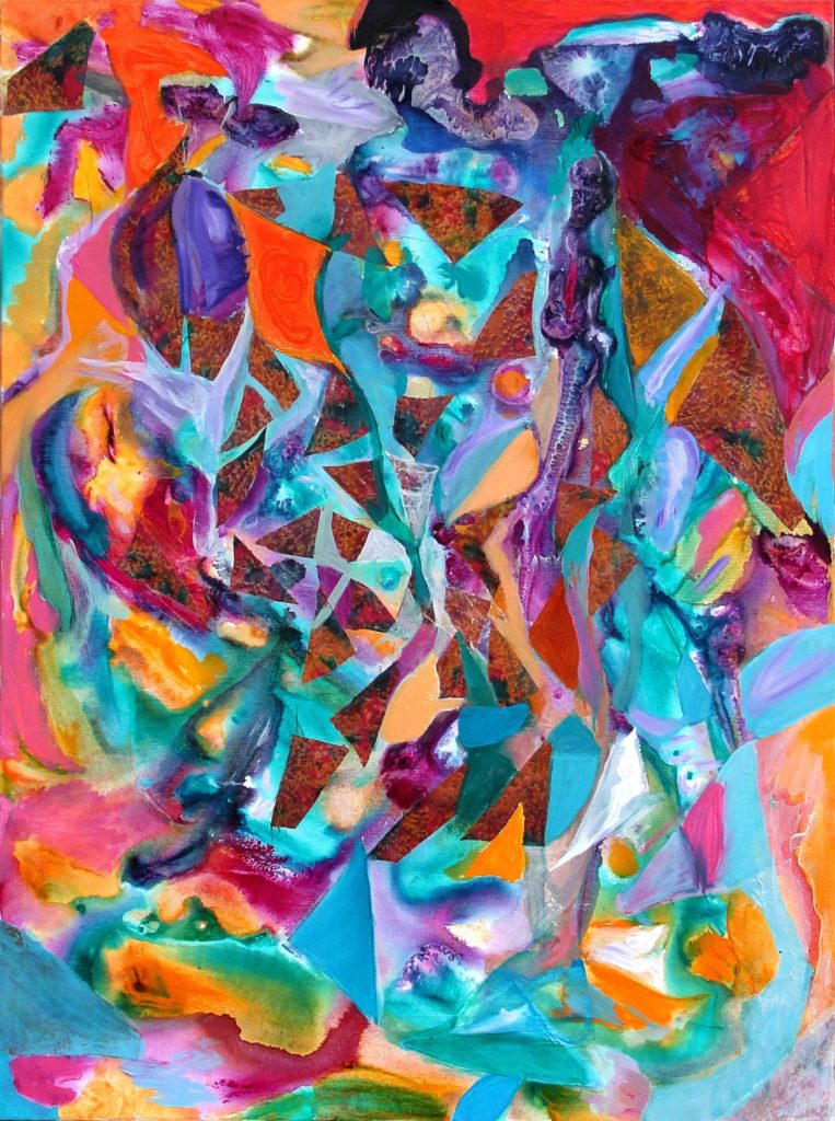 “Broken Idols”, 40×30″ mixed media on canvas was selected by Caitlin Berry, the juror of the Art League’s September 2021 “Heroes and Villains” Exhibit. As part of my Fractured series, in this fluid metamorphic composition, I depict the public “heroes” who turn into “villains” as all historical and contemporary dictators and cult leaders do. I have used different viscosity of paint together with collaged pieces of fabric I’ve printed separately to achieve this dynamic movement. This piece has crimson red edges symbolizing the bloody revolutions which often topple such idols.